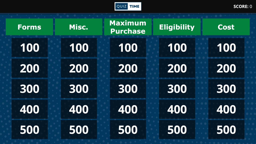 I had already created a template of this activity, called Quiz Time, during my time in the educational technology graduate program as a project for one of my courses. It is a “Jeopardy” style activity that focuses on gamification of content. I told the foundational trainers that I had this project made as a template, and that all I needed was to input content. We started with one foundational training module and decided to pilot the activity with a class of trainees.